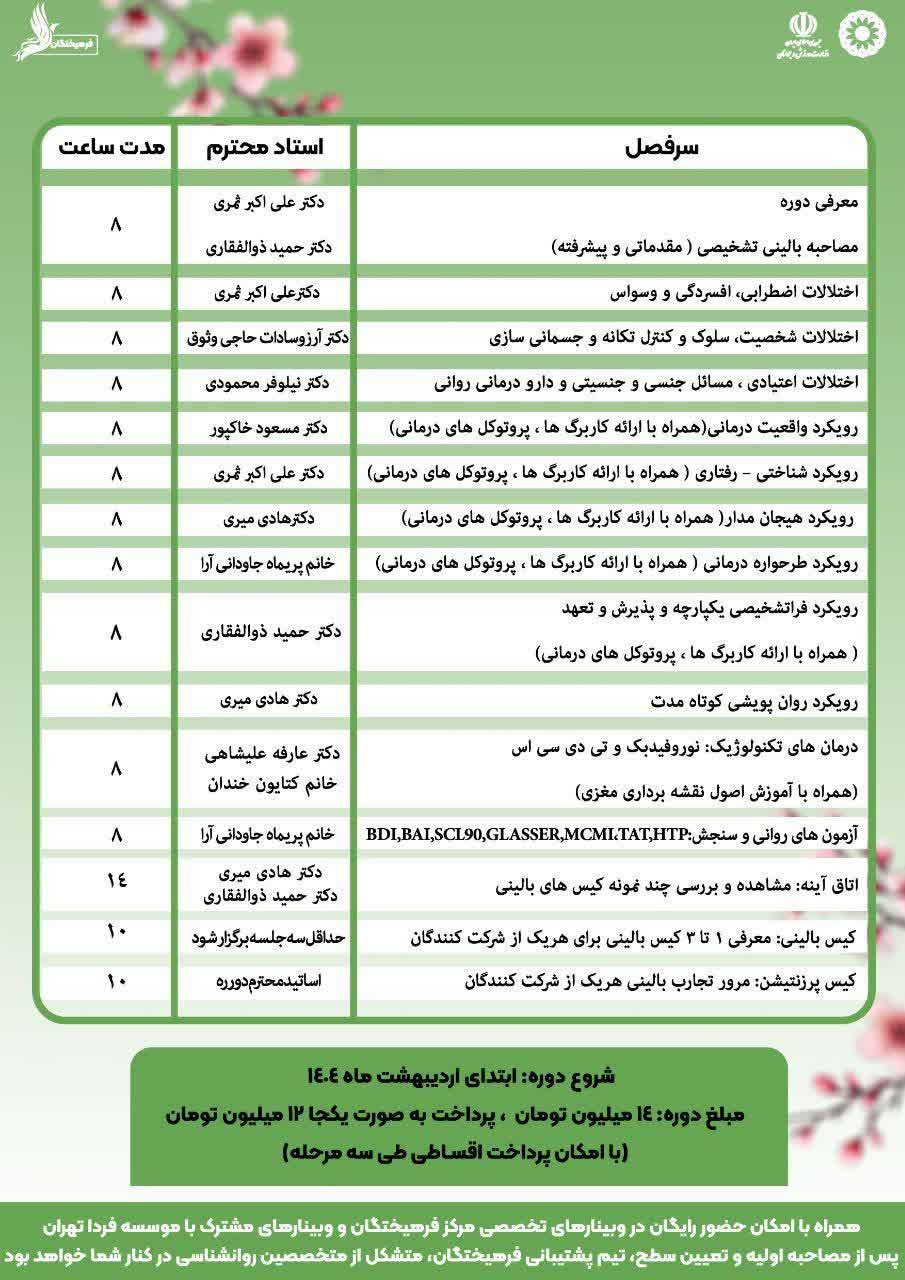 این دوره تخصصی با عنوان مدرسه جامع تربیت درمانگر ، با حضور جمعی از علاقهمندان و متخصصان روانشناسی ، در کلینیک روانشناسی فرهیختگان برگزار گردید.